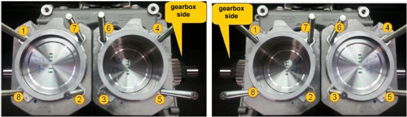 Align the cylinder heads with the fixture provided and tighten the nuts to 10 Nm according to the screw sequence and then to 30 Nm according to the screw sequence.